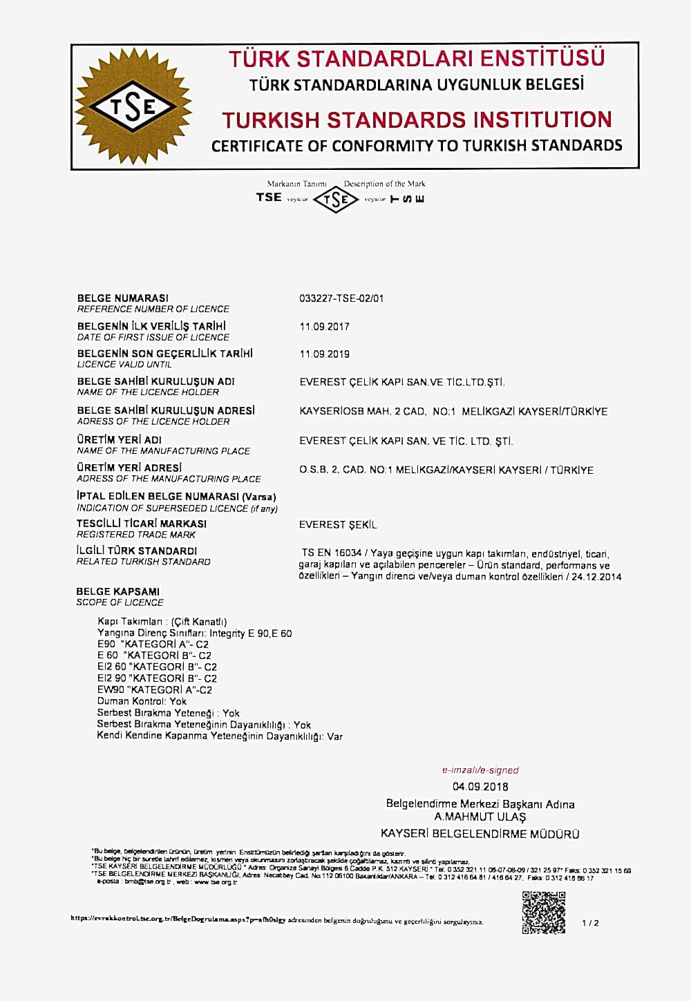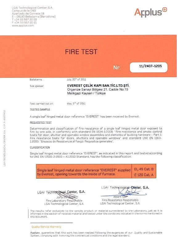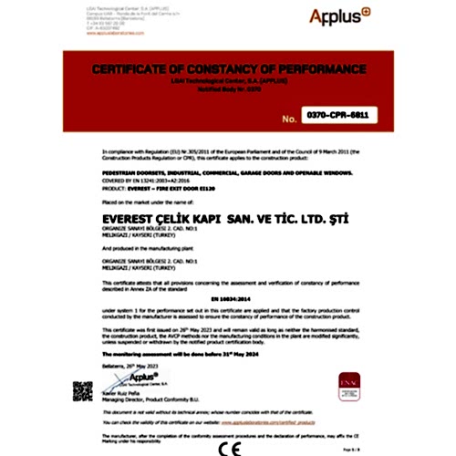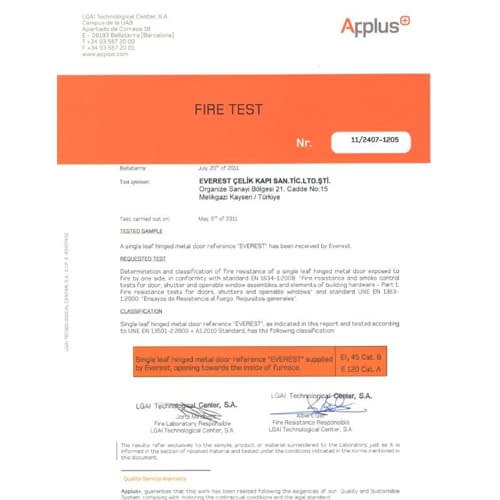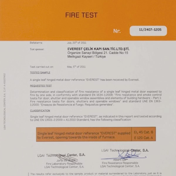 YANGIN KAPILARI İÇİN TÜRK STANDARDINAUYGUNLUK BELGESİ