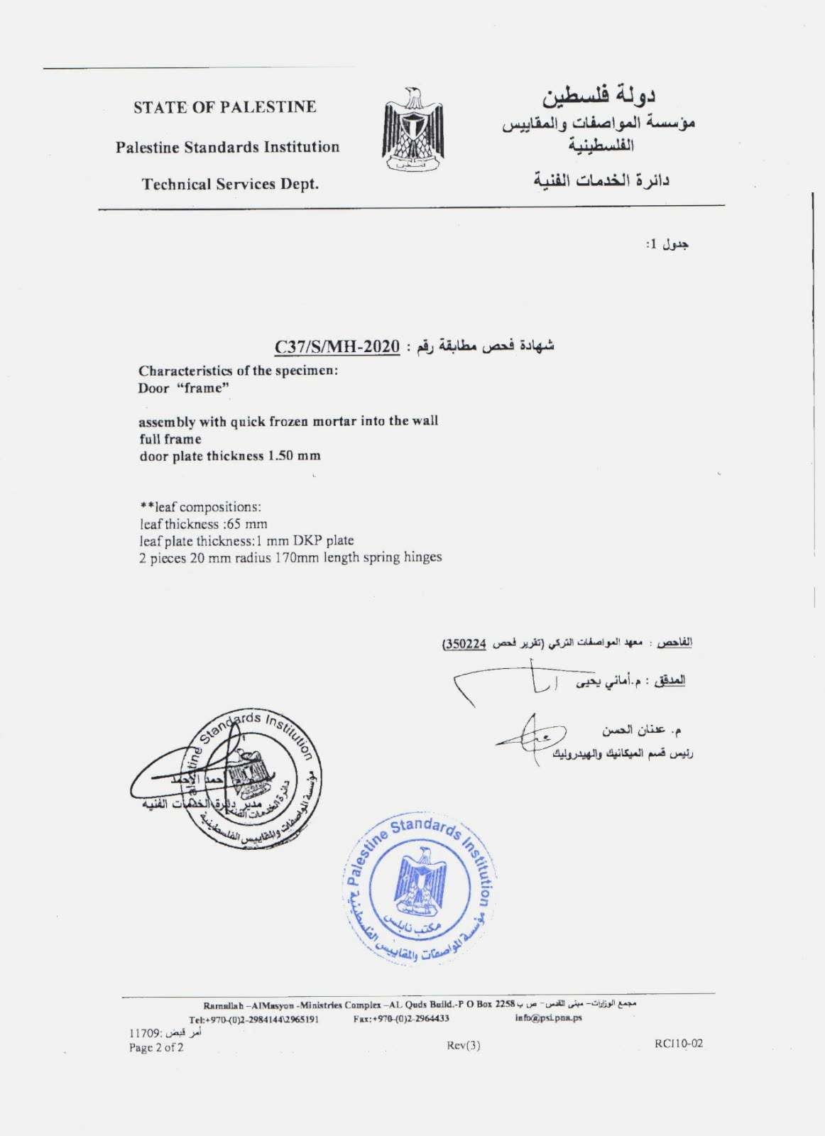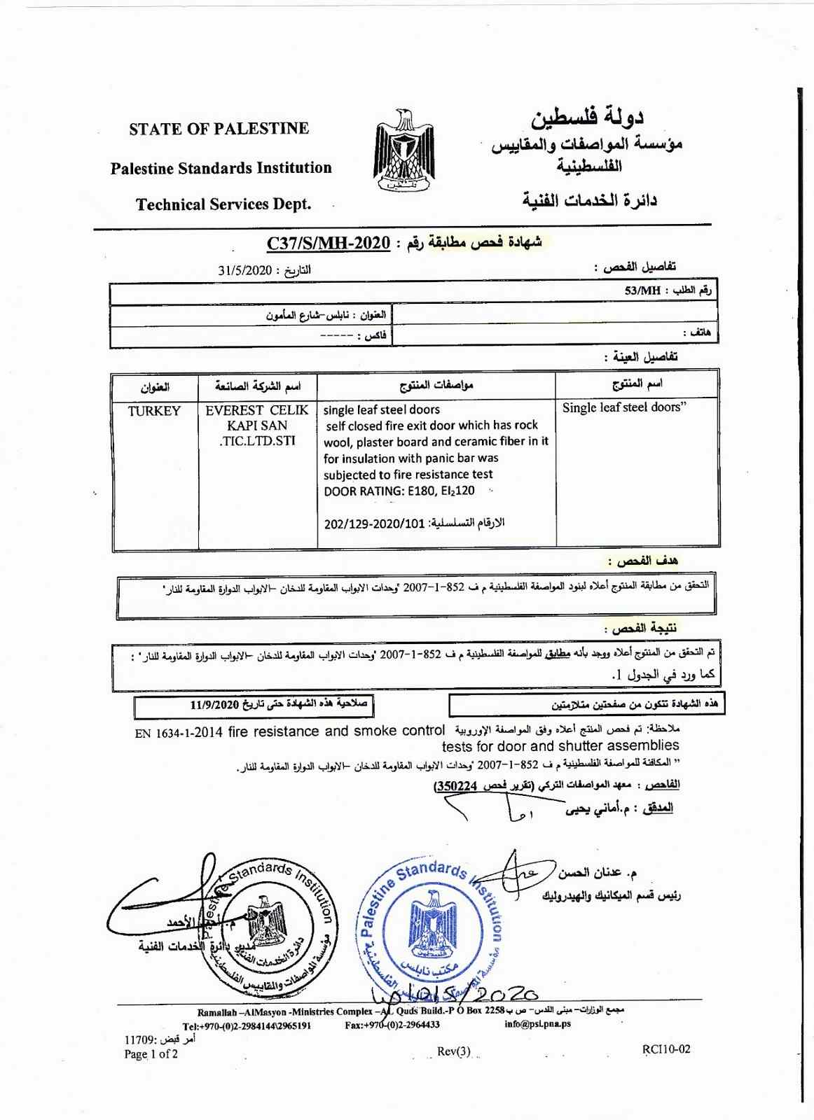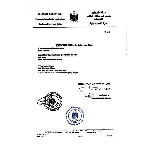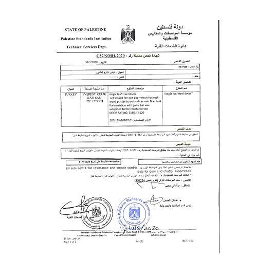 FİLİSTİN STANDARTLARI ENSTİTÜSÜÇELİK KAPI UYGUNLUK BELGESİ