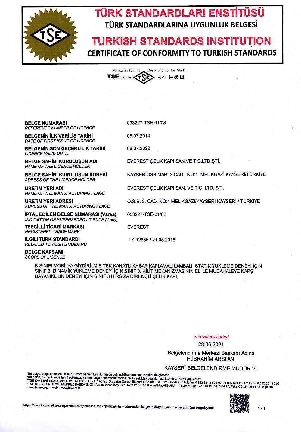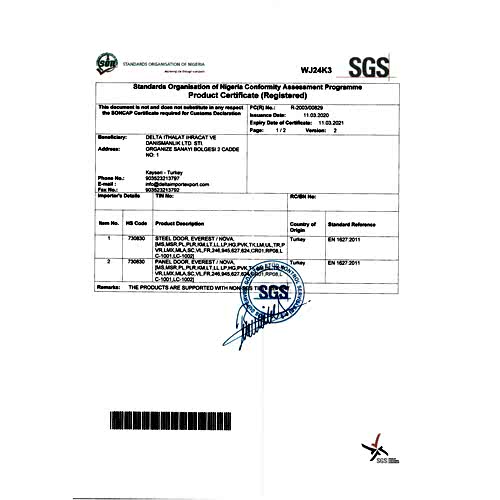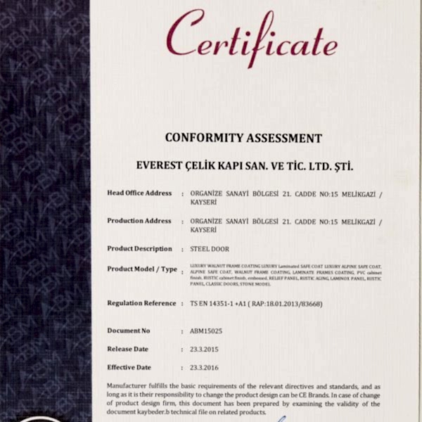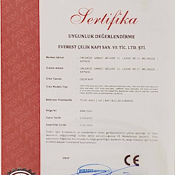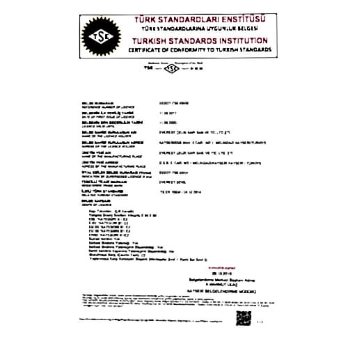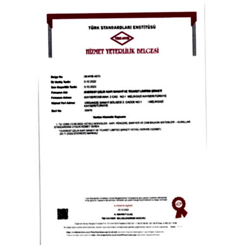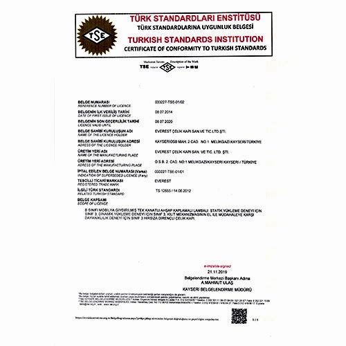 ÇELİK KAPILAR İÇİN TÜRK STANDARDINAUYGUNLUK BELGESİ
