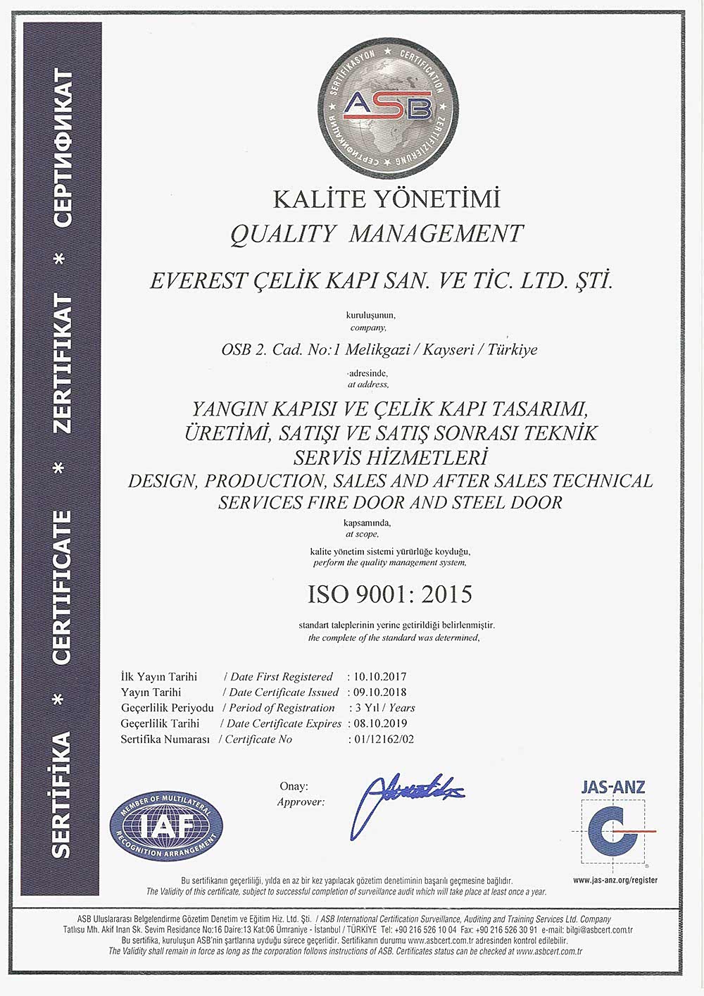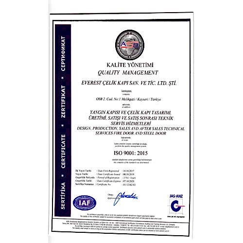 ISO 9001:2005ÇELİK KAPI UYGUNLUK BELGESİ